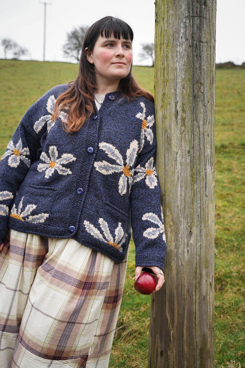 This daisy sweater is beautiful! It’s thick and super warm, a little oversized like I like it, and the buttons are attached well—they don’t feel loose like I’ve seen on some garments. The pattern is so cute. I get compliments on it all the time! I love that it has pockets too! Really beautiful and durable construction.