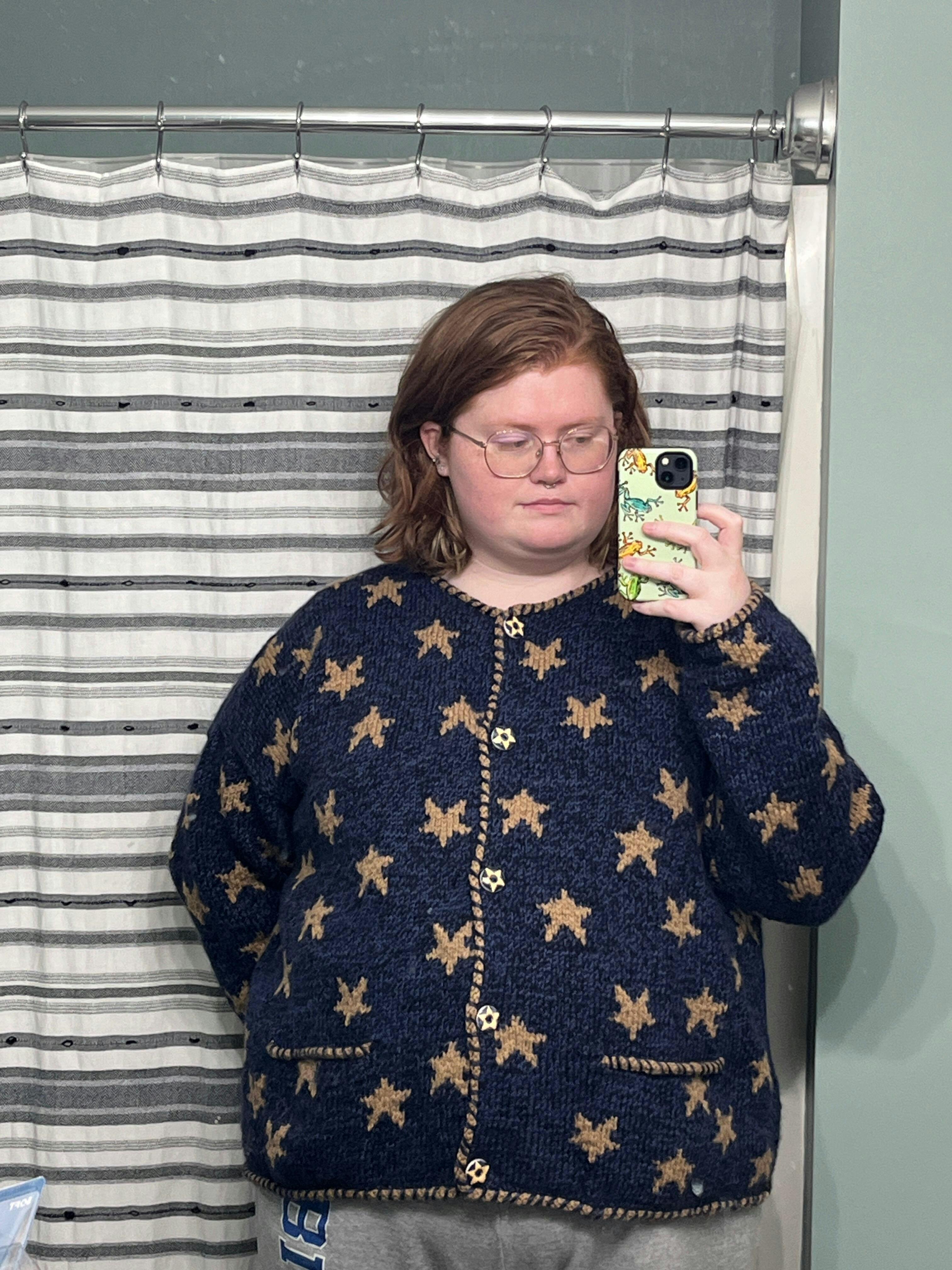 The classic hand knit star cardigan has a rolled bound edge and random stars dotted across the front and back. Now with star ceramic buttons! The cardigan’s original incarnation was in the mid 90s, todays production is in a much softer wool.