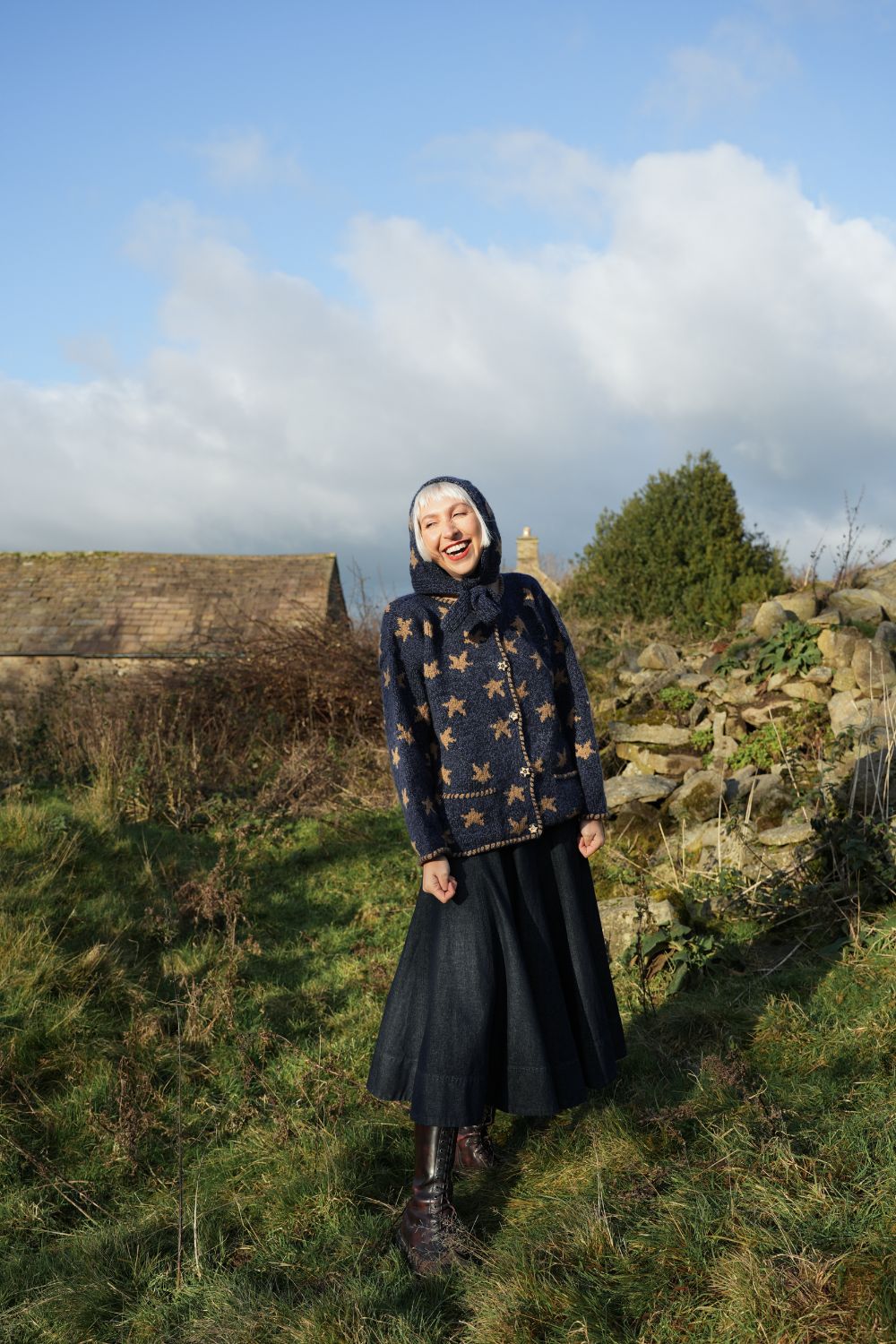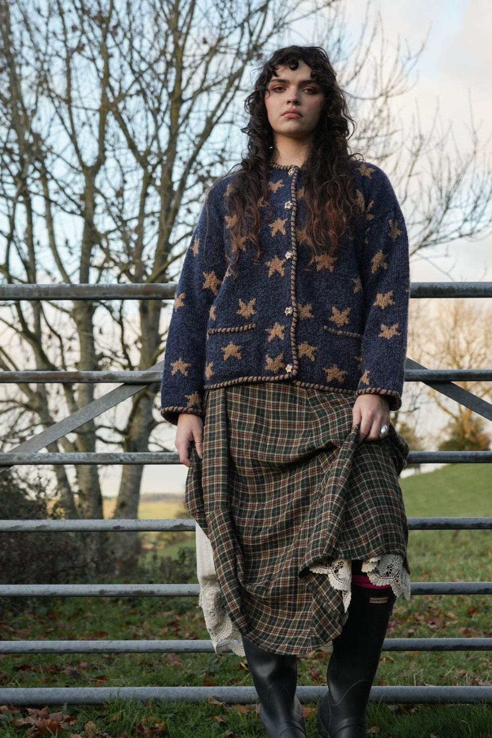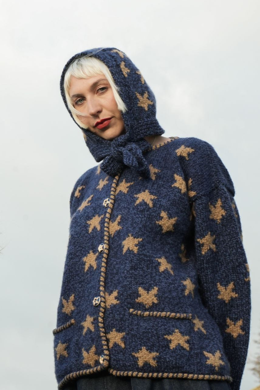 The classic hand knit star cardigan has a rolled bound edge and random stars dotted across the front and back. Now with star ceramic buttons! The cardigan’s original incarnation was in the mid 90s, todays production is in a much softer wool.