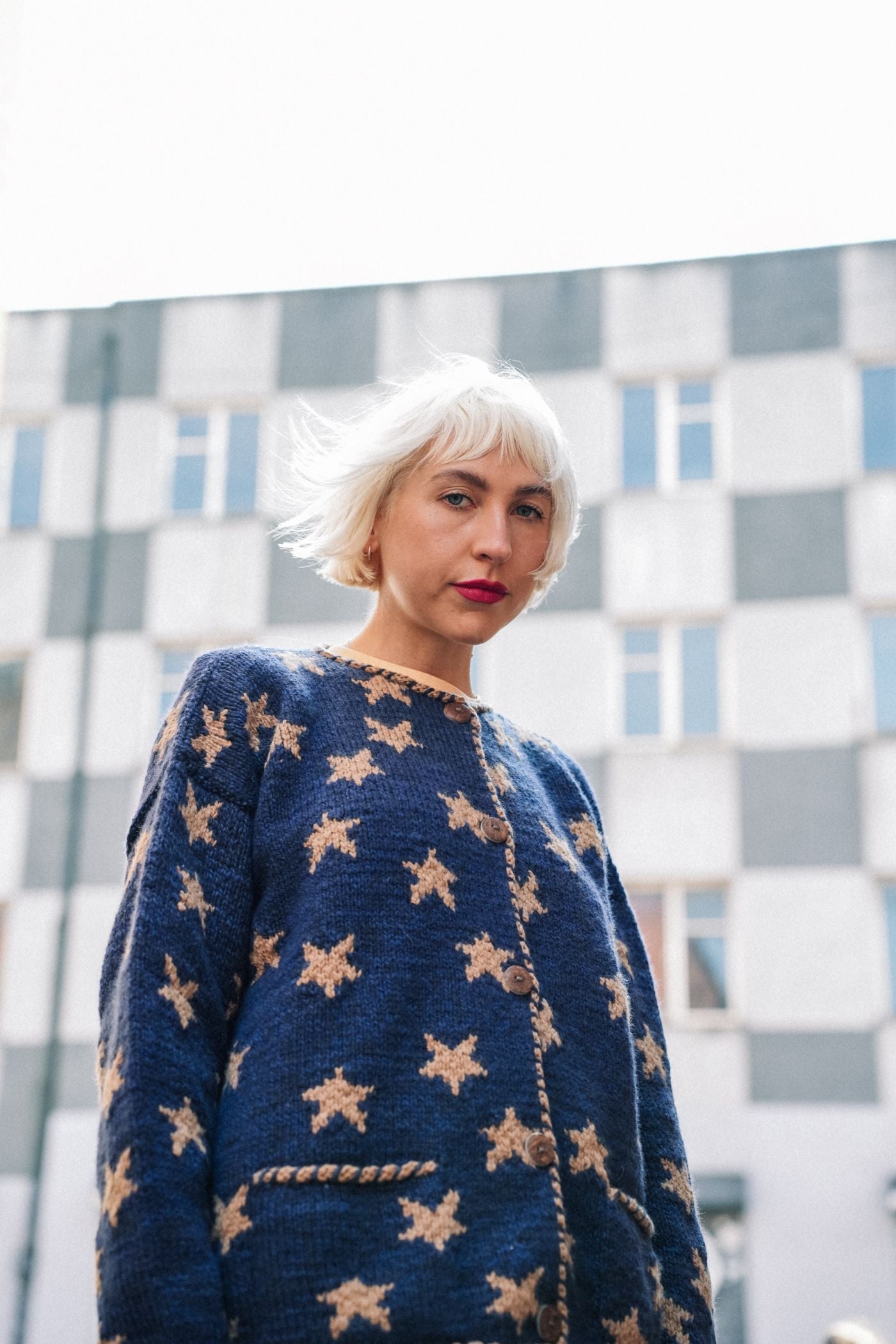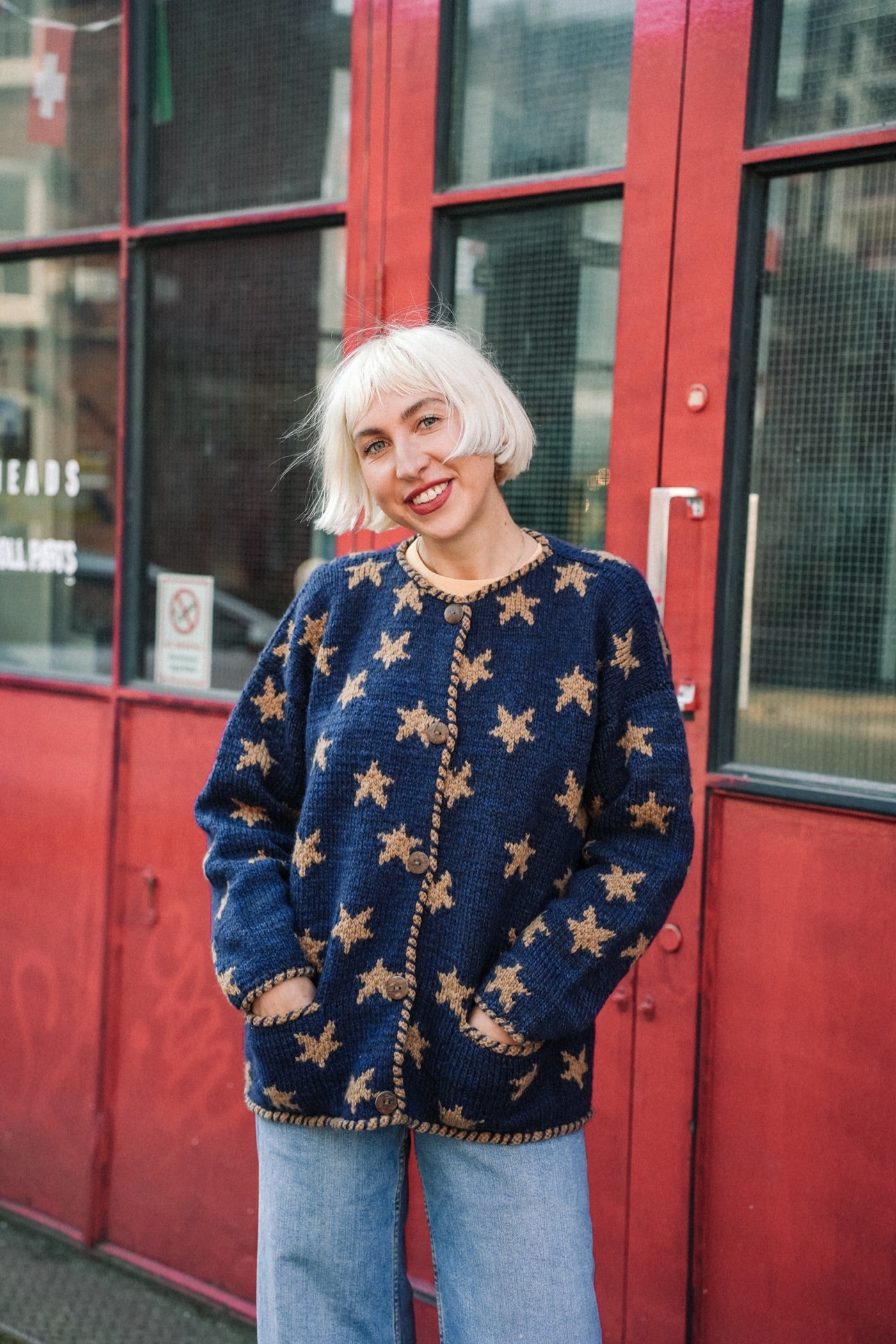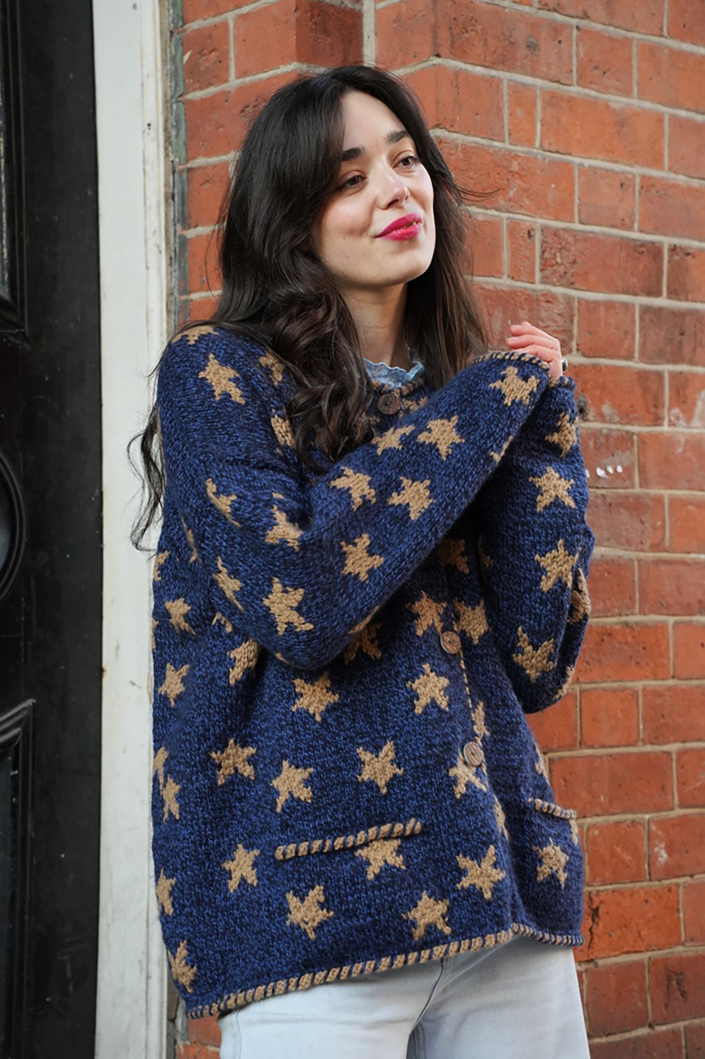 The classic hand knit star cardigan, rolled bound edge, random stars dotted around both front and back. The cardigan's original incarnation was back in the mid 90's; there are some differences such as the quality of wool is much softer, and the buttons are made from environmentally friendly tagua (nut), however in spirit it is very close to the original.