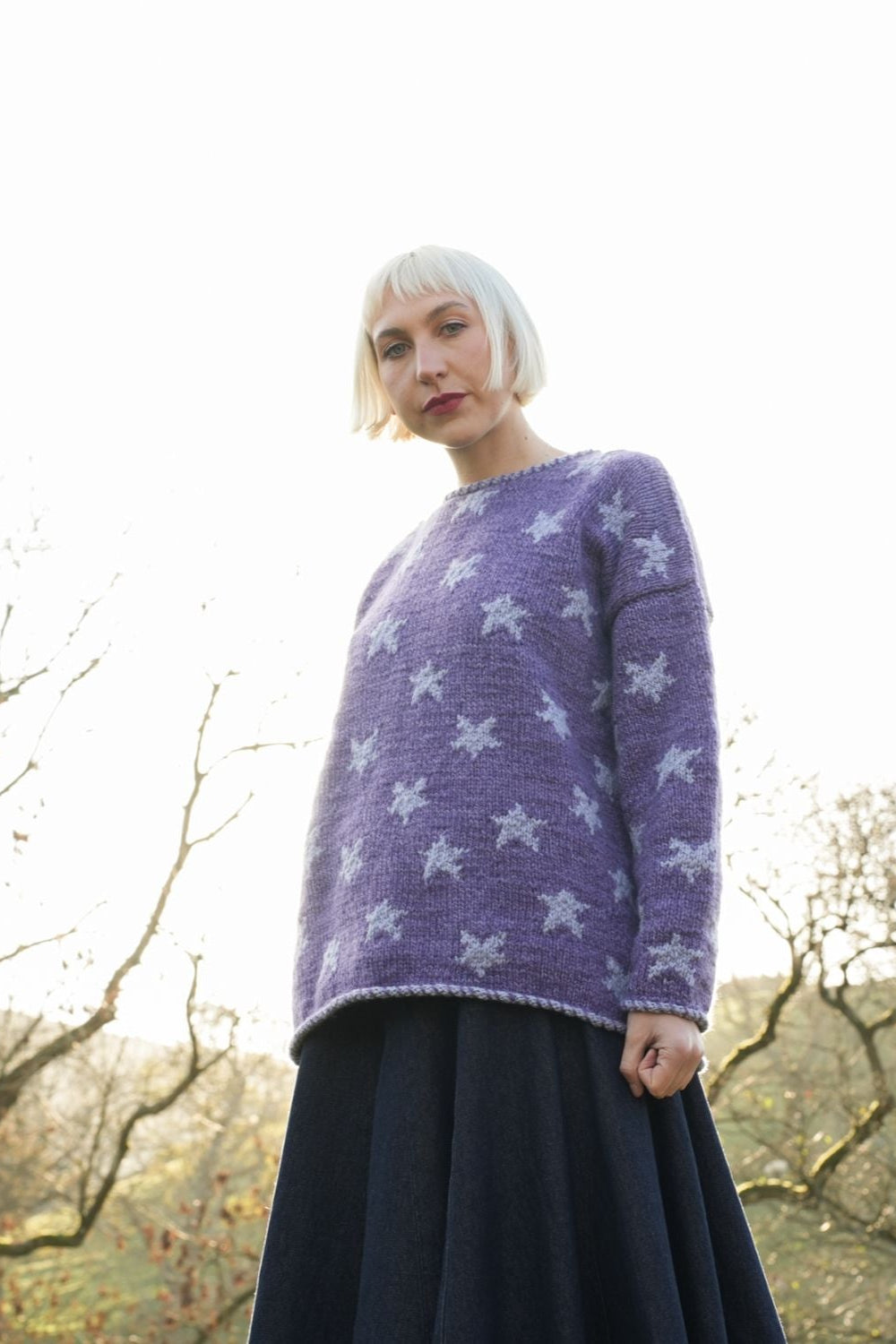 The iconic hand knit Star Pullover is available in a new limited-edition purple. Features a boxy silhouette with dropped sleeves, rolled whipped edge and random star placement.