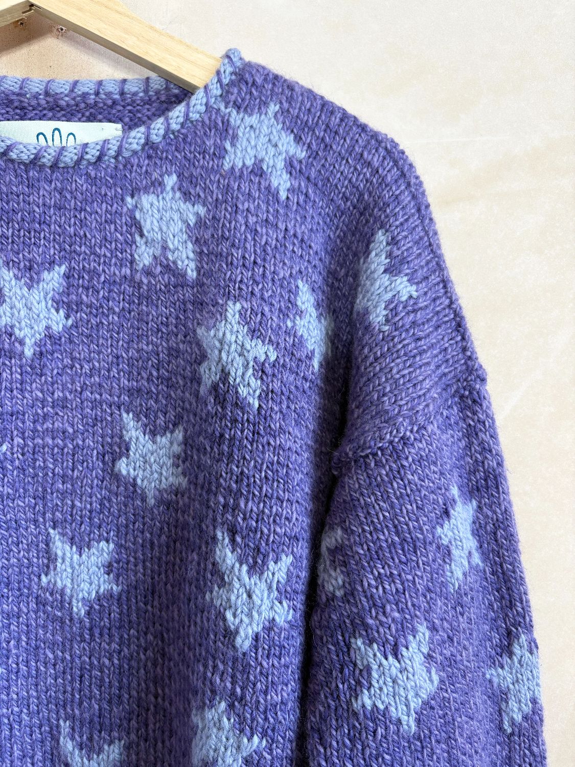 The Iconic hand knit star pullover in new limited edition Purple. In a boxy silhouette with dropped sleeves, rolled whipped edge and random star placement.