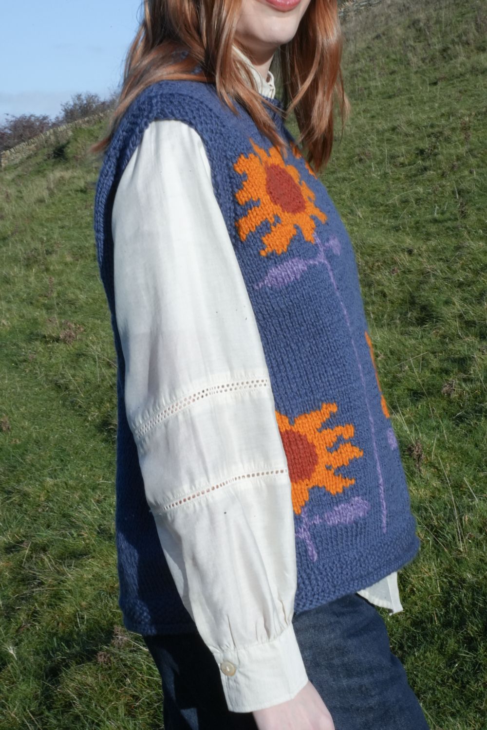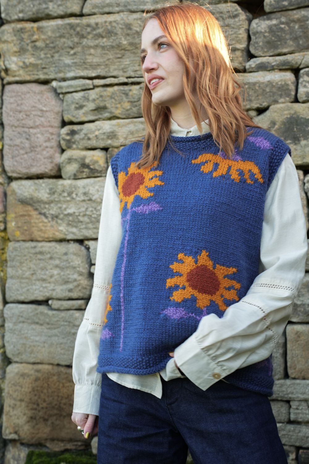 The Sunflower Knitted Vest is a relaxed-fit wool vest designed for easy, everyday layering. Rooted in Amano heritage, it features four sunflower motifs, knitted using our archive sunflower design. A soft, heirloom knit designed to be worn often and loved for years.