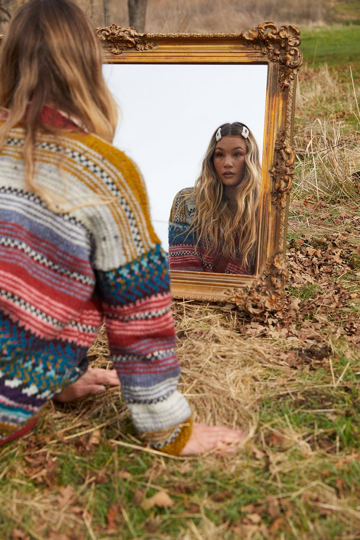 Sophia is wearing a medium our vintage Amano blanket cardigan, reworked with muted colours and graphic roll edge.